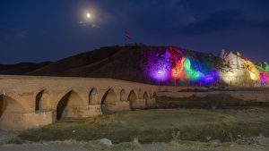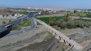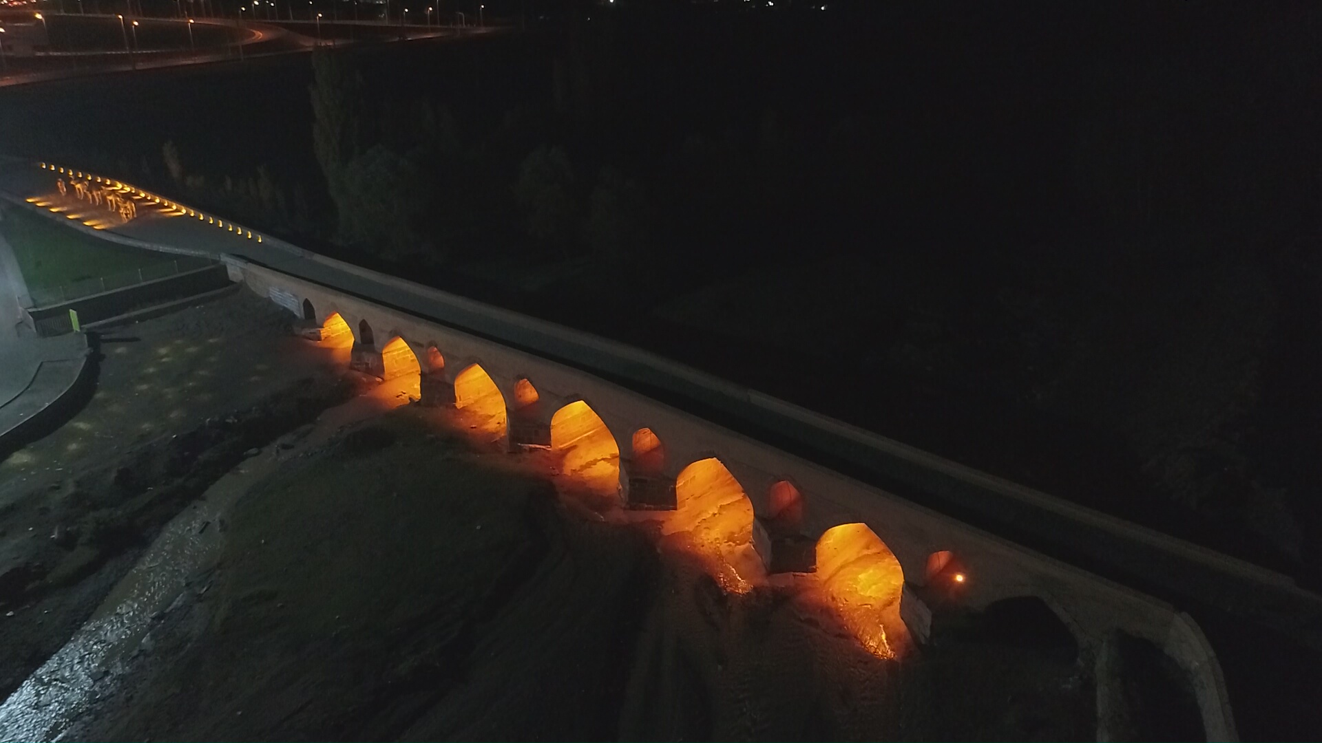 این پل بین دو طرف رودخانه و برو روی پایه های سنگی ، هفت دهانه منظم به صورت طاق های تزئینی تعبیه شده که با ساختمان اصلی بنا هماهنگی جالب توجهی دارد.